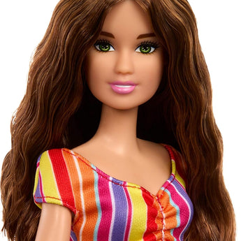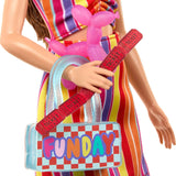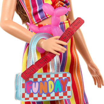 Barbie er klar til en magisk og farverig dag på tivoliet! Hun kommer iført et festligt outfit med farverig top, nederdel og sneakers – perfekt til en dag fyldt med sjov. De stjernede solbriller og den ternede taske fuldender hendes lyse og drømmende look. Med tilbehør som ballonhund, billetter og popcorn kan børn lege utallige historier og oplevelser ved det summende tivoli.