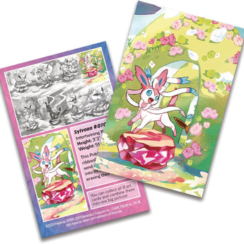 Indeholder et Pokémon kunstkort med motiv fra tin’en – saml og kombiner alle 8 designs