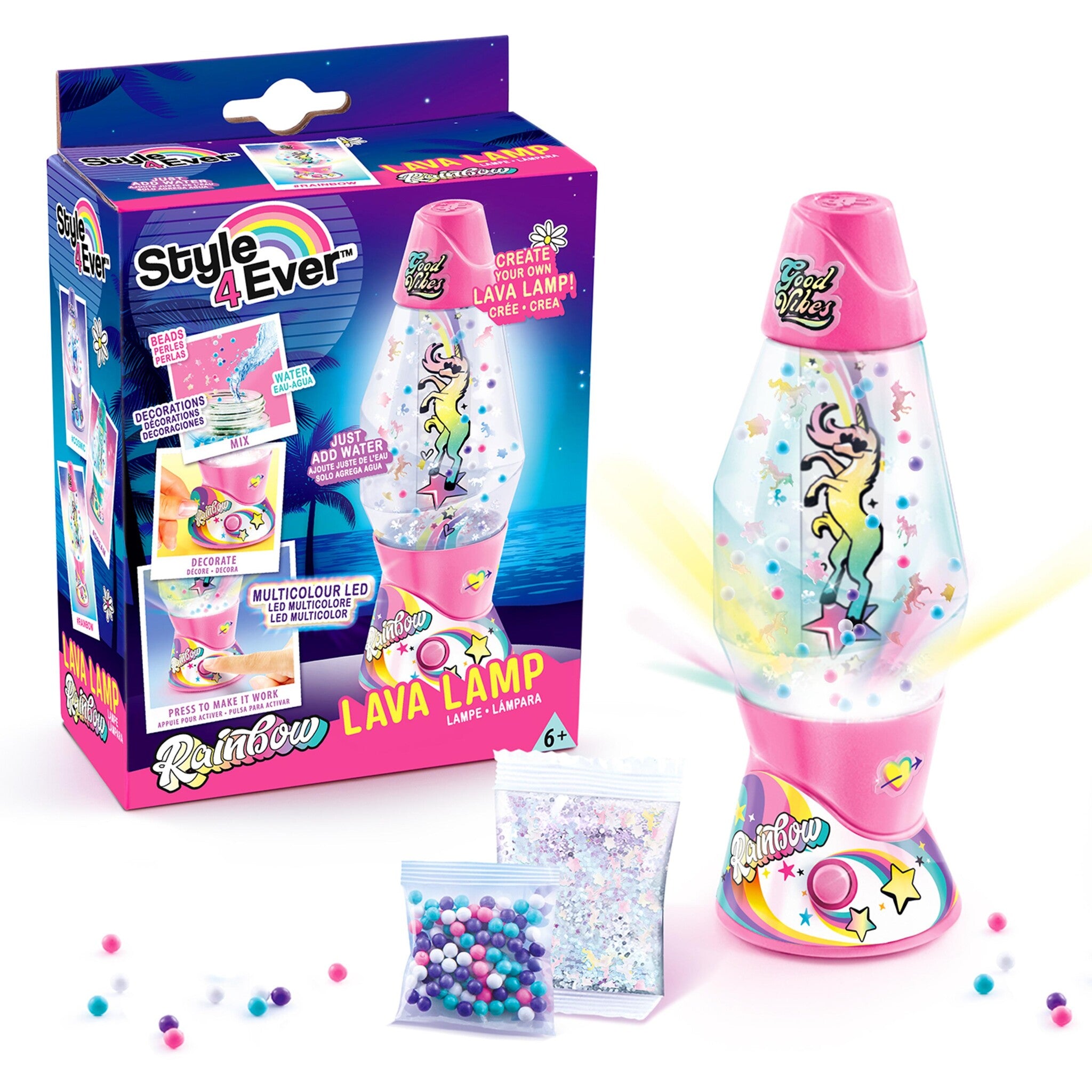 Lav din egen lavalampe med Style 4 Ever! Med dette kreative sæt kan børn designe, dekorere og samle deres helt personlige lampe med glimmer, perler og klistermærker – og se den lyse op i flotte farver med LED-lys.